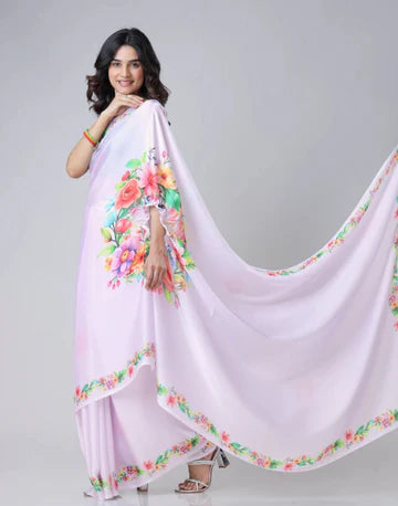 We use high-quality fabrics like georgette, satin, chiffon, organza and premium blends to ensure comfort, elegance and a perfect drape.